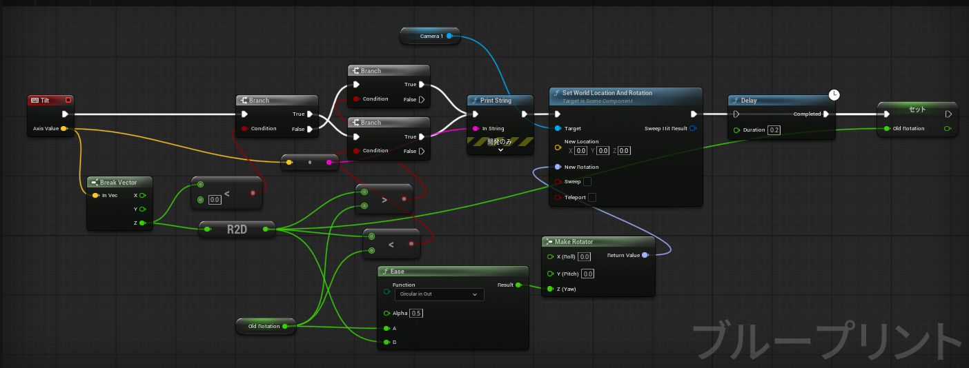 で、カクカクしないようにEASEで補正をかける。のだがスタート(移動前)を用意する必要があるので、一旦現在地を保存しておく。(ここではOldRotation変数)でこれをスタートにして最新の値をゴールにする。
