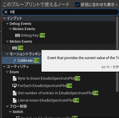 UE5でAndroid端末(GalaxyA25で開発中)のジャイロセンサーの向きを指す値を得て、実際の動きとUE5のレベルでの動きをリンクさせるにはイベントTiltを使う。TiltイベントはAndroid(プラグインを使用することが前提)にあるジャイロセンサーから得た値を受け渡すイベントのもよう。