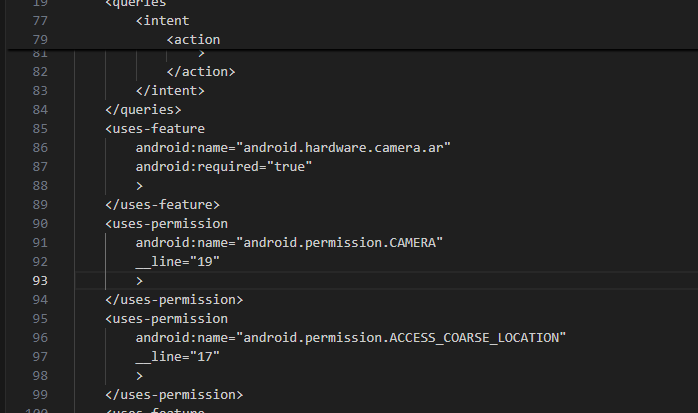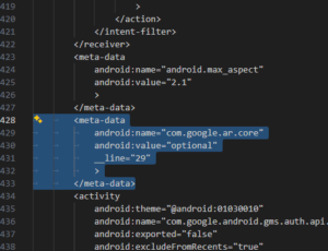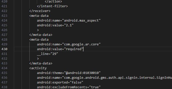 <meta-data android:name="com.google.ar.core" android:value="required" __line="29"> </meta-data>