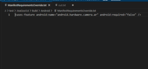 これか。上書きしといて必須(required)にしていて矛盾がループしてエラーってんのかな?なのでこのチェックを外してManifestRequiementsOverride.txtの中を<uses-feature android:name=”android.hardware.camera.ar” android:required=”false” />だけにして再ビルドしてみた。