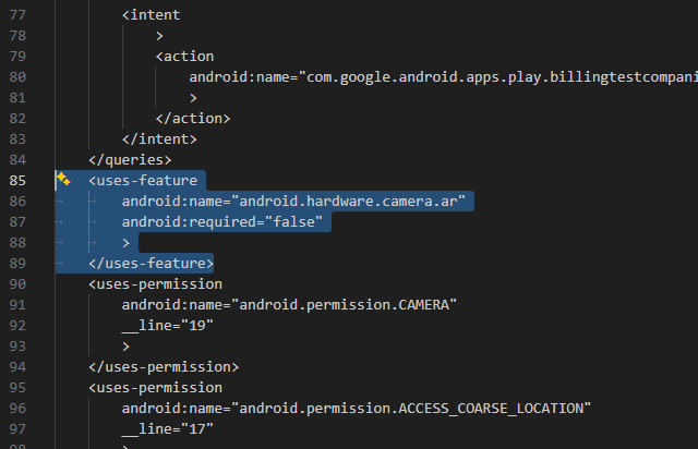 <uses-feature android:name="android.hardware.camera.ar" android:required="true"> </uses-feature>