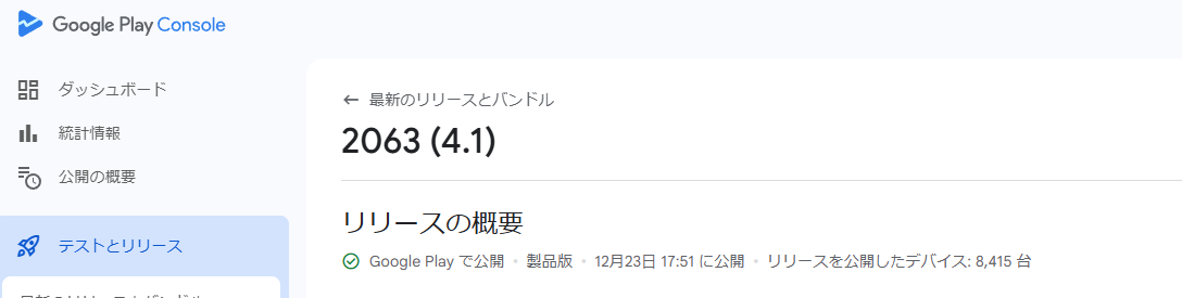 で。GalaxyA25(16)とoppoA79(14)でテストしてPlayConsoleにアップした。