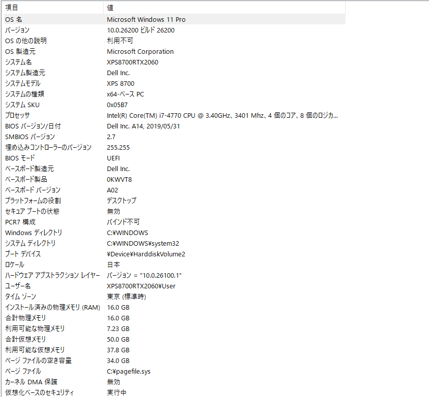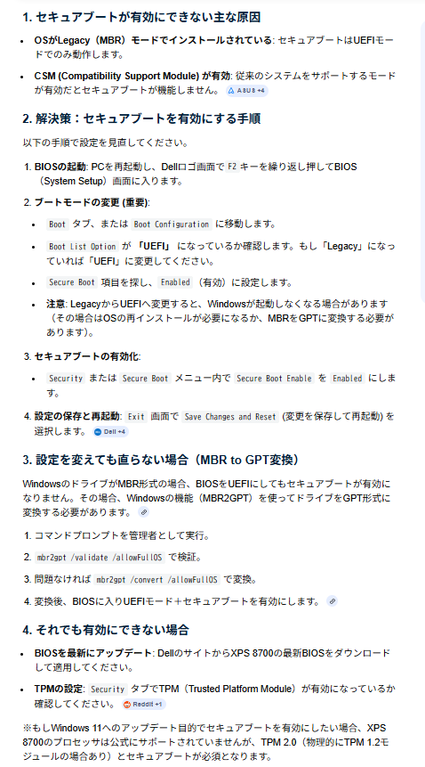 とりあえず’Windows UEFI CA 2023’証明書はFalseだったが、HPの25H2もIdeapad330の25H2もセキュアブートが有効だったのでXPS8700もBiosの項目にセキュアブートの項目があるので有効にできないものか調べてみる。BiosのバージョンはA06になっていて最新はA14のようだ。A06ではDesableが固定されていて変更できない。