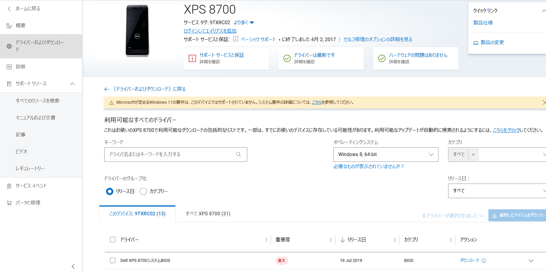 そしたらDELLのXPS8700のサポートページから最新のBiosをDLする。
